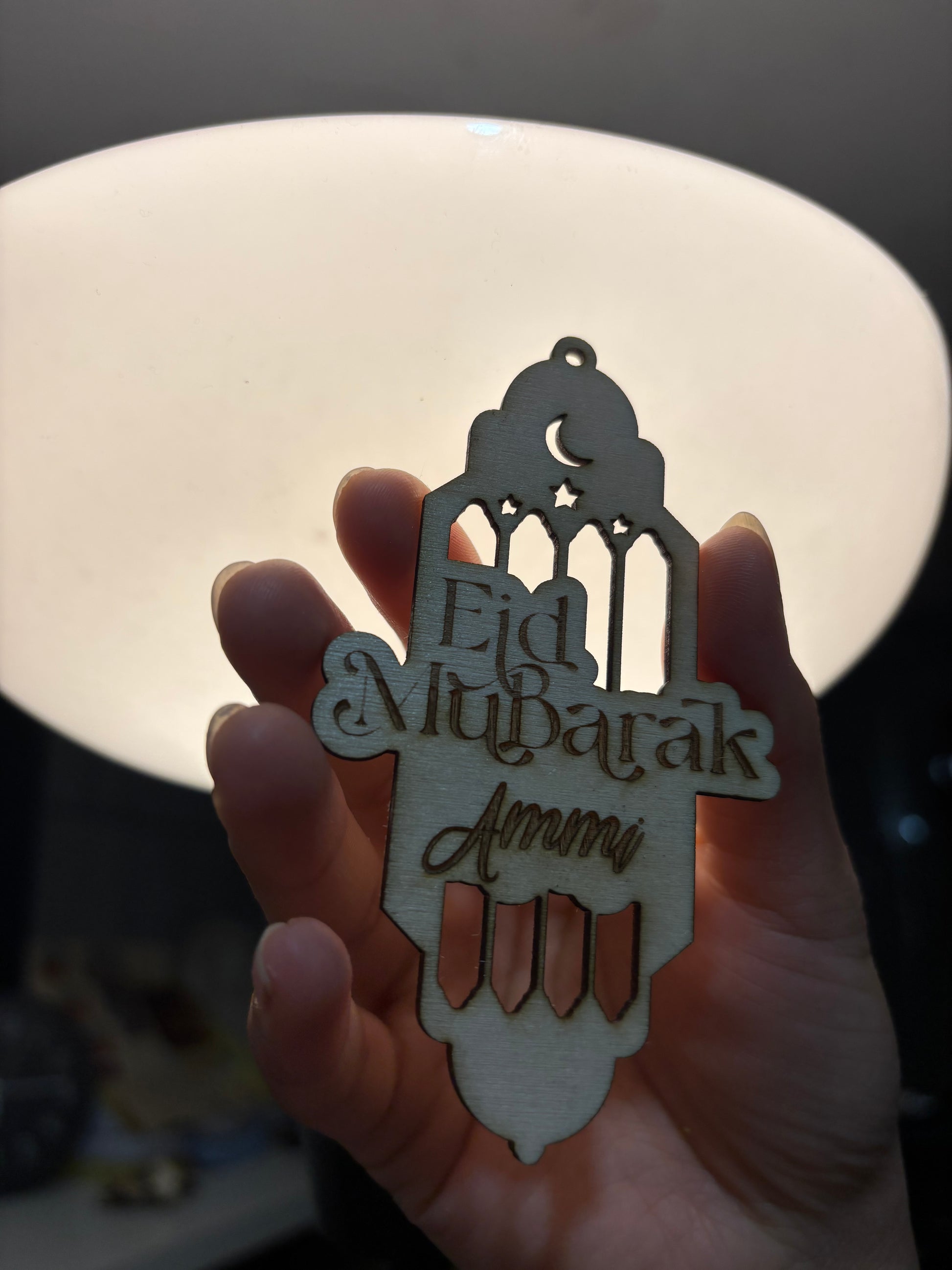 Add a heartfelt touch to your Eid gifts with our beautifully handcrafted wooden Eid Mubarak tags. Laser-cut with intricate detailing, this elegant piece features a mosque-style arch with crescent moon and star motifs, and a custom engraving that reads “Eid Mubarak Ammi” – perfect for honouring a beloved mother.